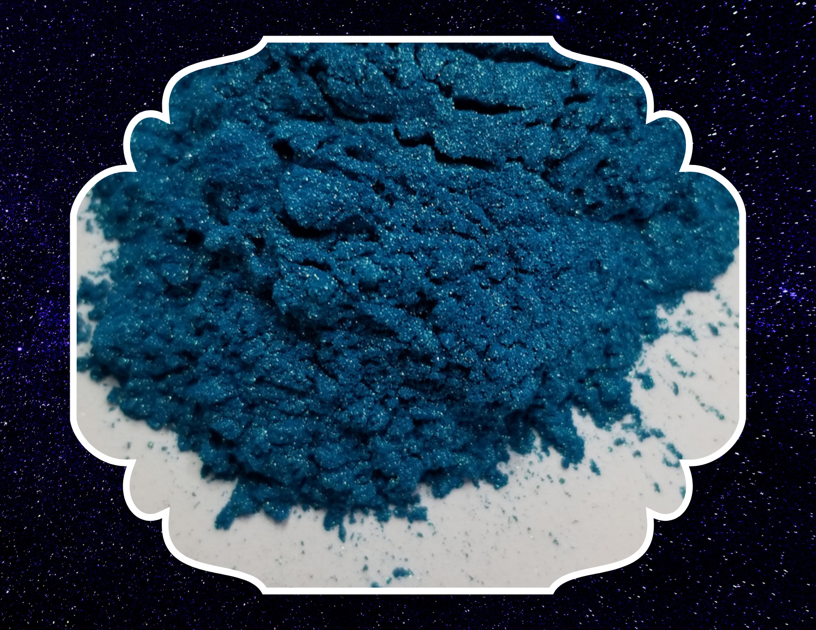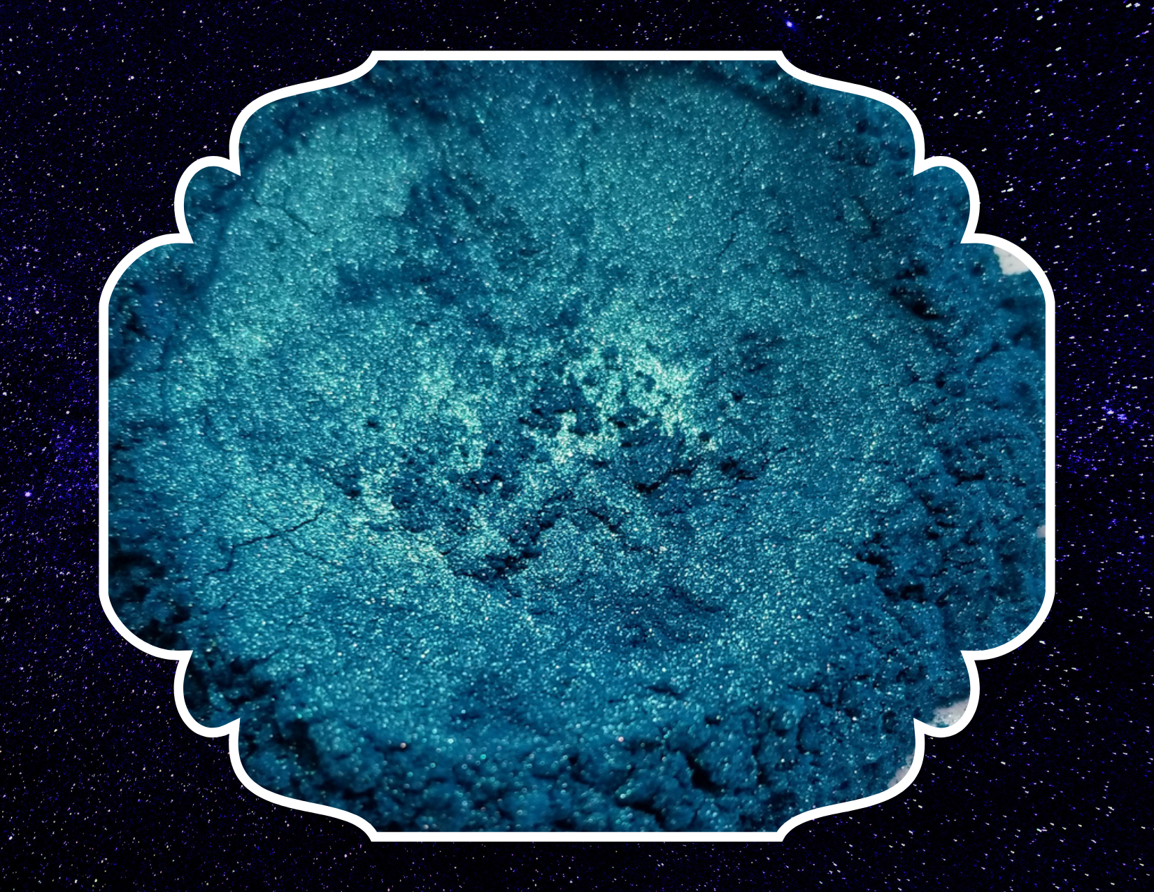 A shimmery Aqua to teal mica powder. This product has high color purity. Sold by volume in a 5 gram pot.