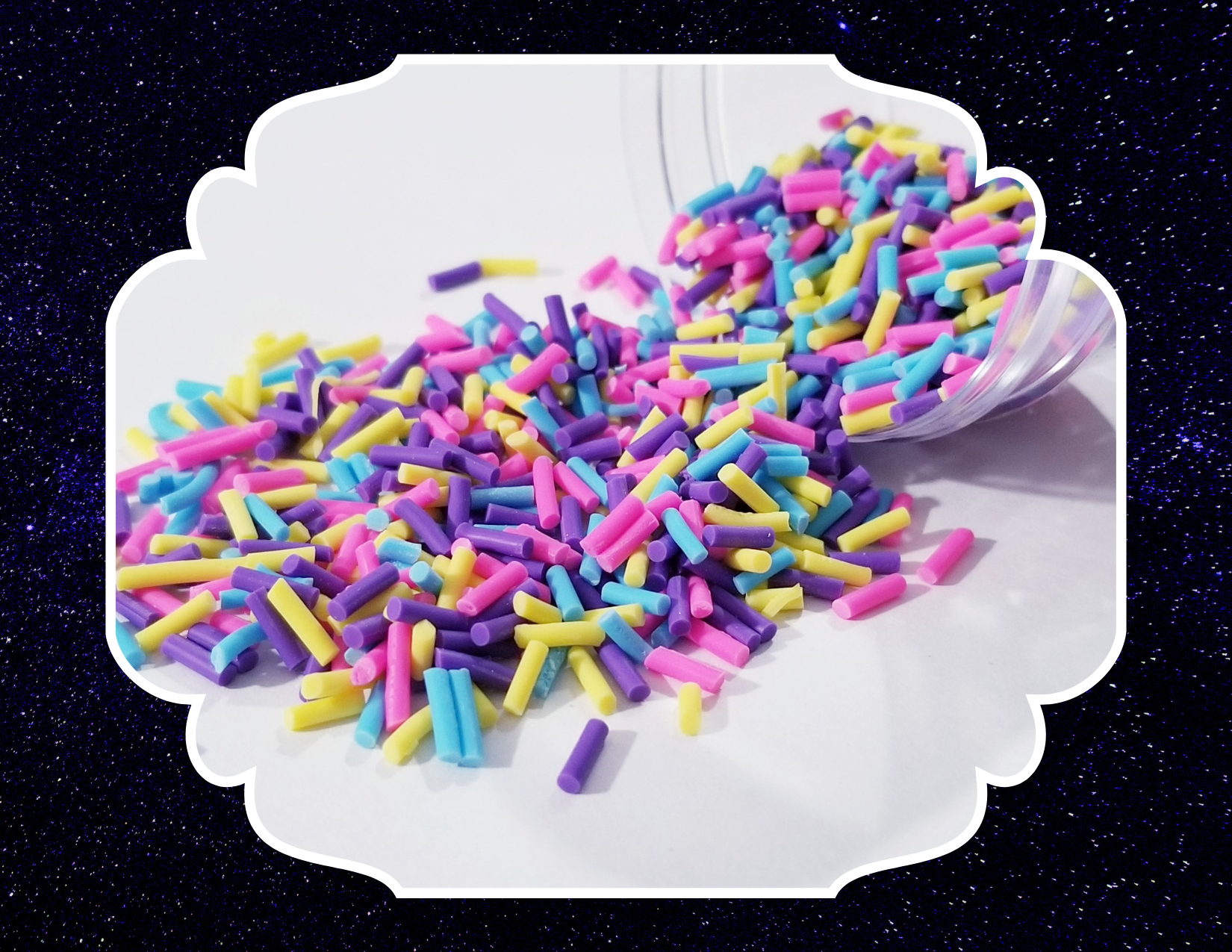 Adorable polymer clay sprinkles! This charming mix of classic 80's colored sprinkles is adorable. This is sold in a 1/2 ounce jar.