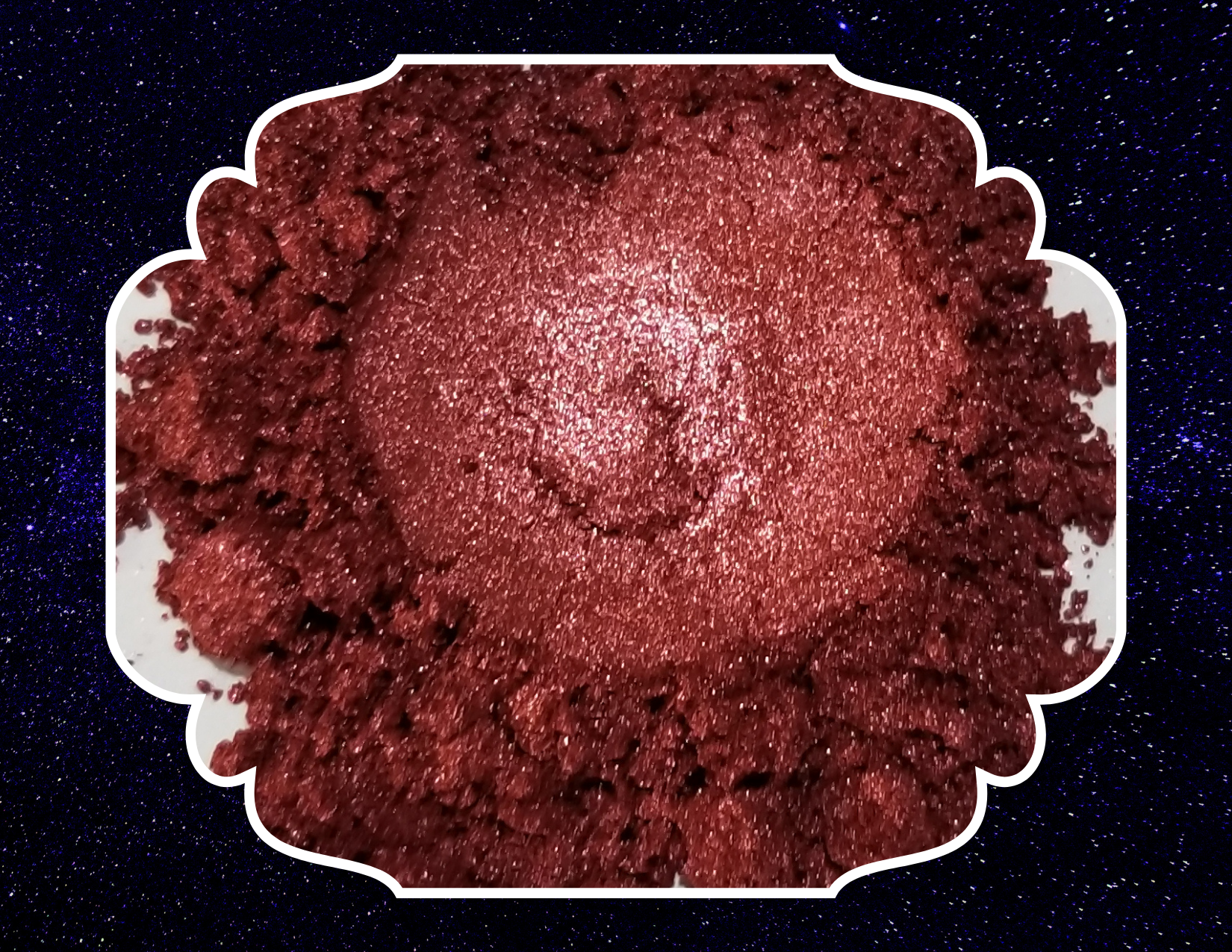 A shimmery burgundy to bordeaux mica powder. This product has high color purity. Sold by volume in a 5 gram pot.