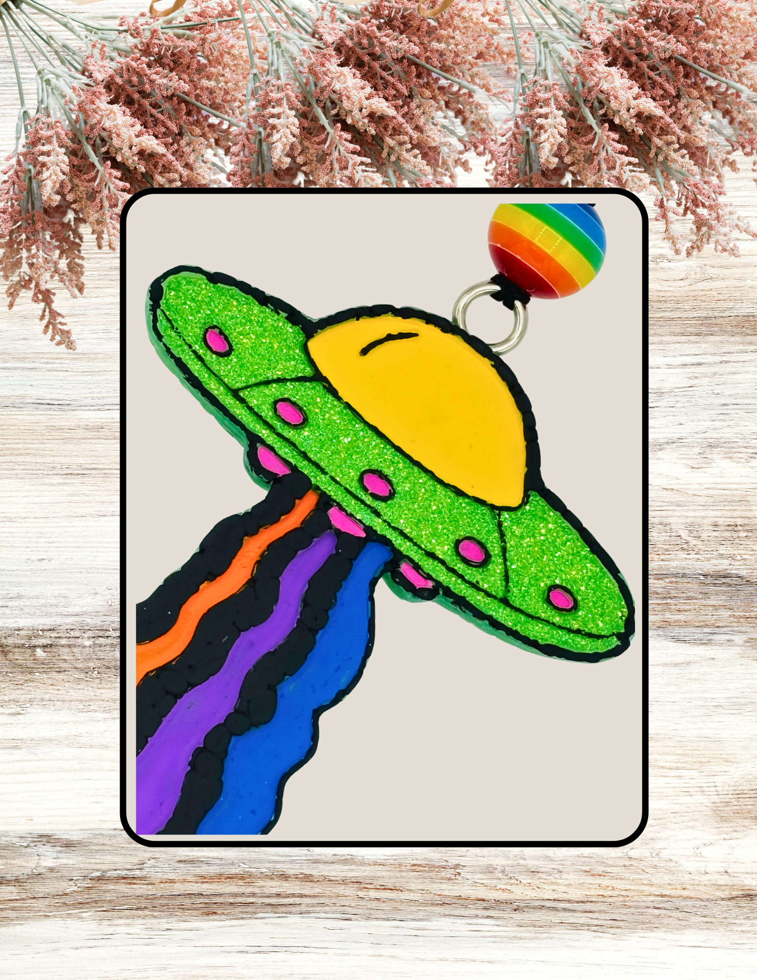 Adorable Alien Abduction design in Green and Multicolors. The fragrance is Mysterious. Awesome for car, or any small space you want to smell amazing!