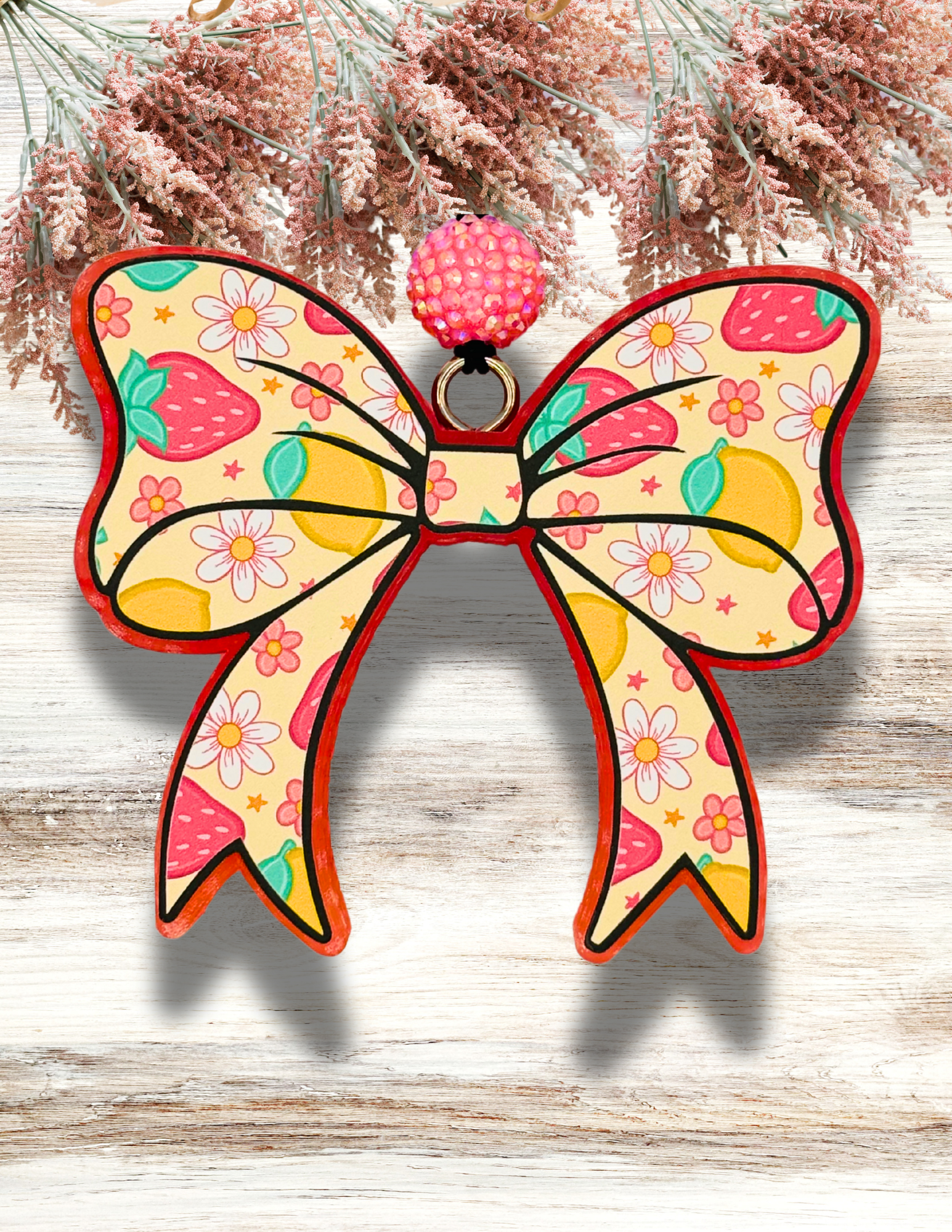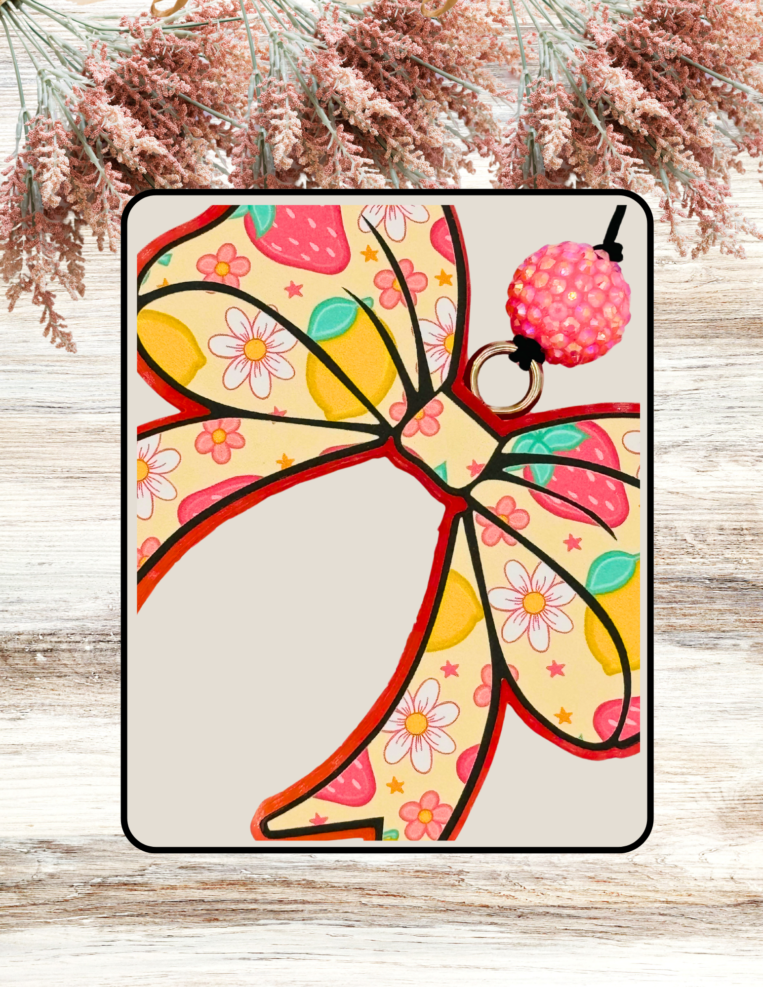 Adorable Bow design with a fun Strawberry, Lemon and Floral Print in Coral. The fragrance is Tropical Lemonade. Awesome for car, or any small space you want to smell amazing!
