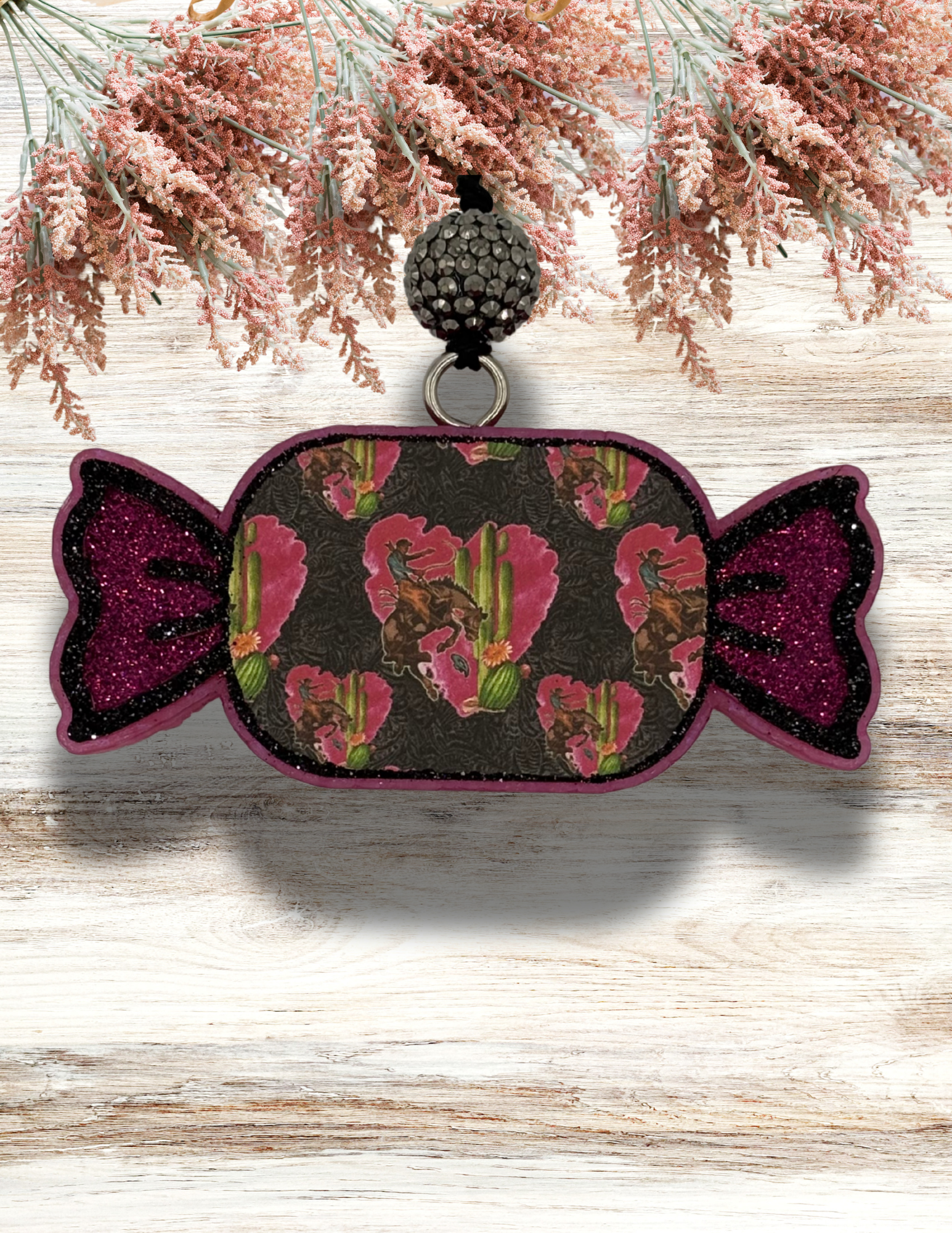 Adorable Candy Bucking Bronco Heart design in Burgundy & Black. The fragrance is Salted Caramel Latte. Awesome for car, or any small space you want to smell amazing!