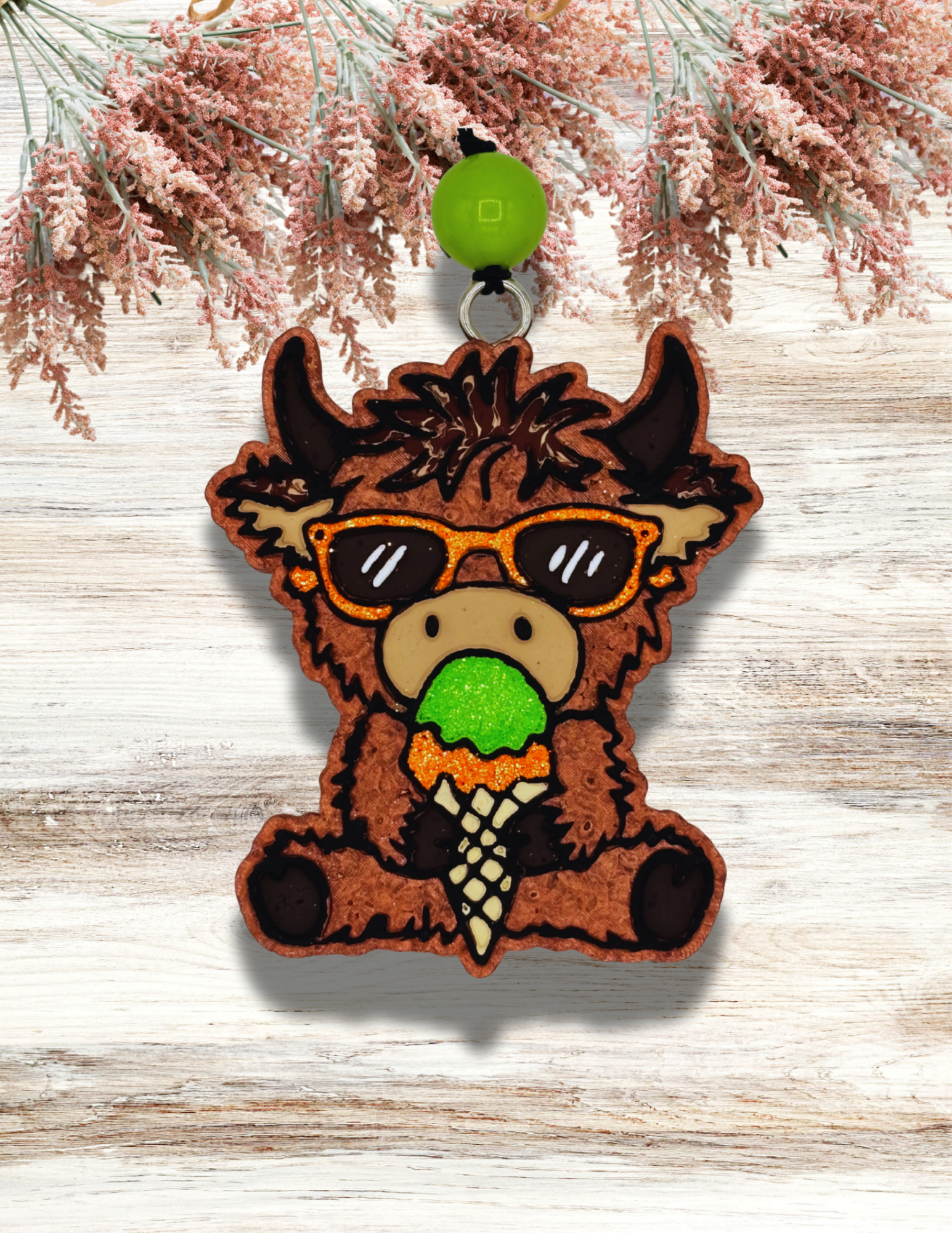Adorable Highland Cow design with Orange Sunglasses & Ice Cream. The fragrance is Strawberry Buttercream. Awesome for car, or any small space you want to smell amazing!