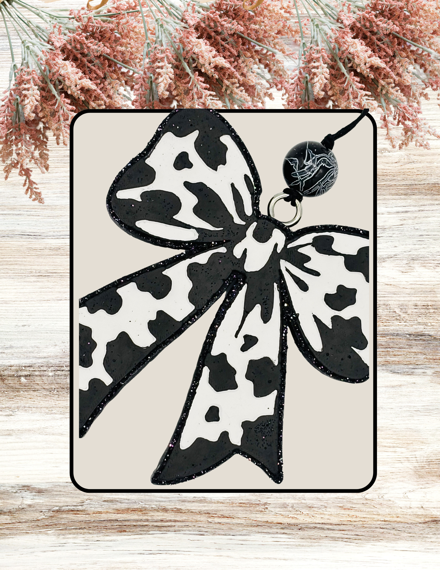 Adorable Cow Print Bow Coquette design in Black and White with Black Glitter trim. The fragrance is Strawberry Guava. Awesome for car, or any small space you want to smell amazing!