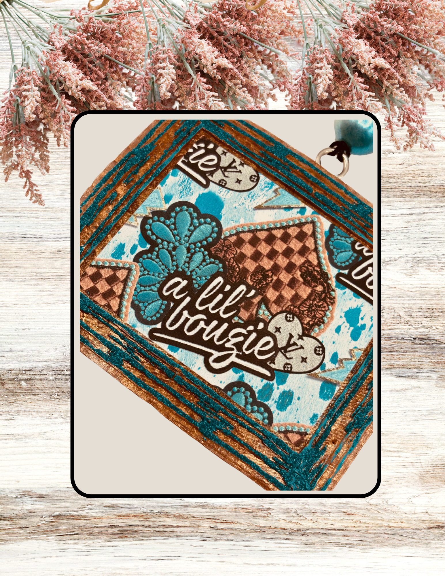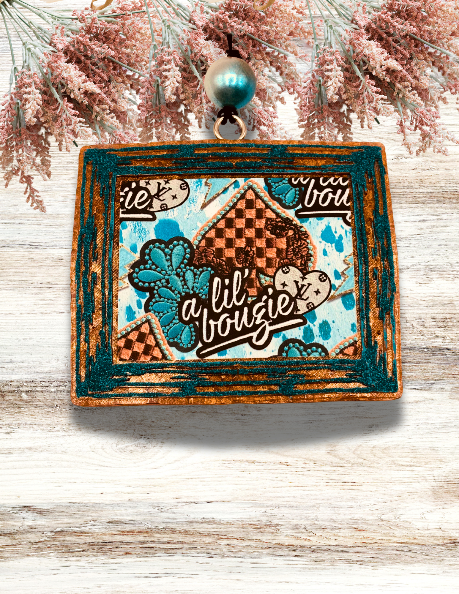 Adorable Frame LV A Lil' Bougie Freshie design in Brown & Teal. The fragrance is Pink Sangria. Awesome for car, or any small space you want to smell amazing!