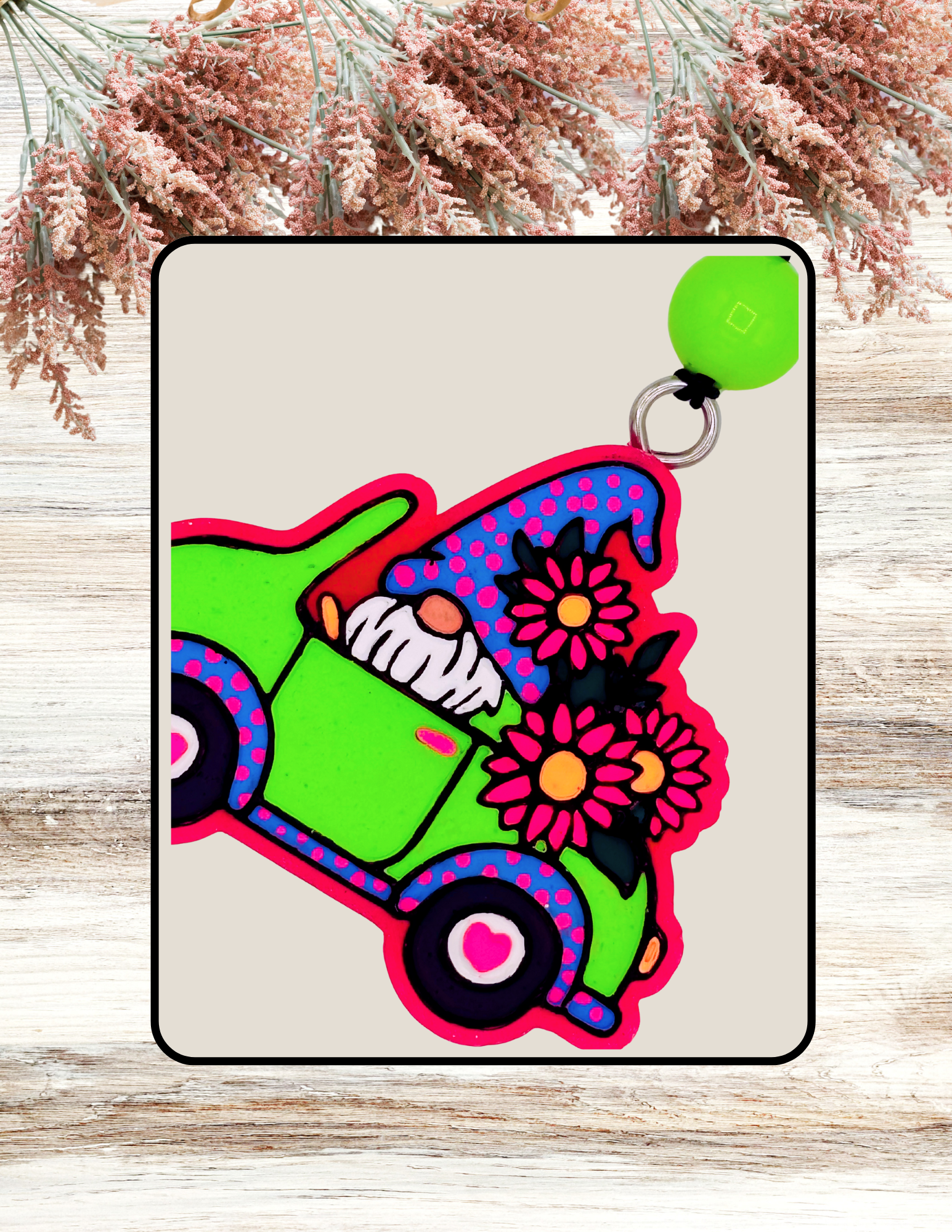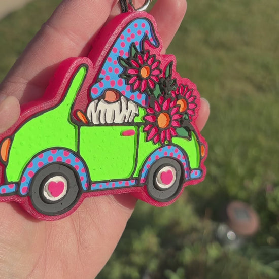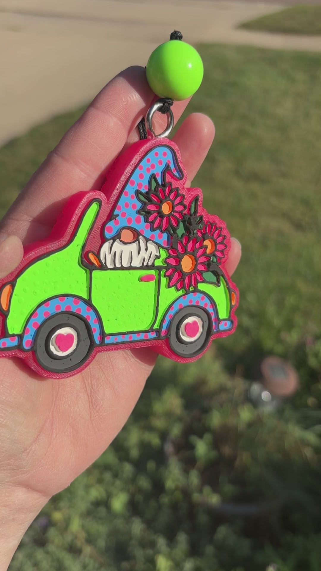 Adorable Gnome Car with Flowers design in Neon Green, Blue and Pink. The fragrance is Pink Sangria. Awesome for car, or any small space you want to smell amazing!