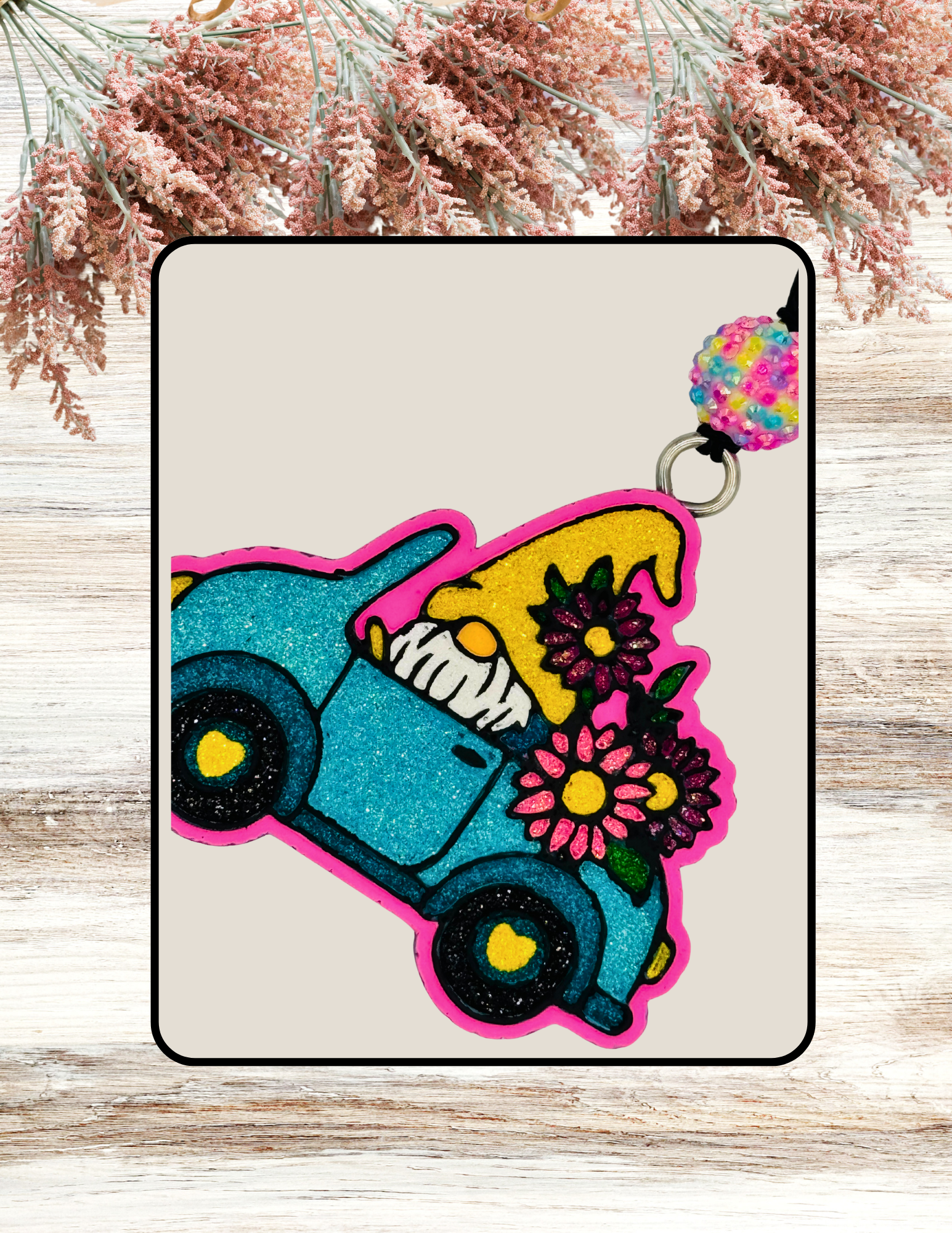 Adorable Gnome Car with Flowers design in Turquoise, Yellow and Pink. The fragrance is Cinnamon Caramel Swirl. Awesome for car, or any small space you want to smell amazing!