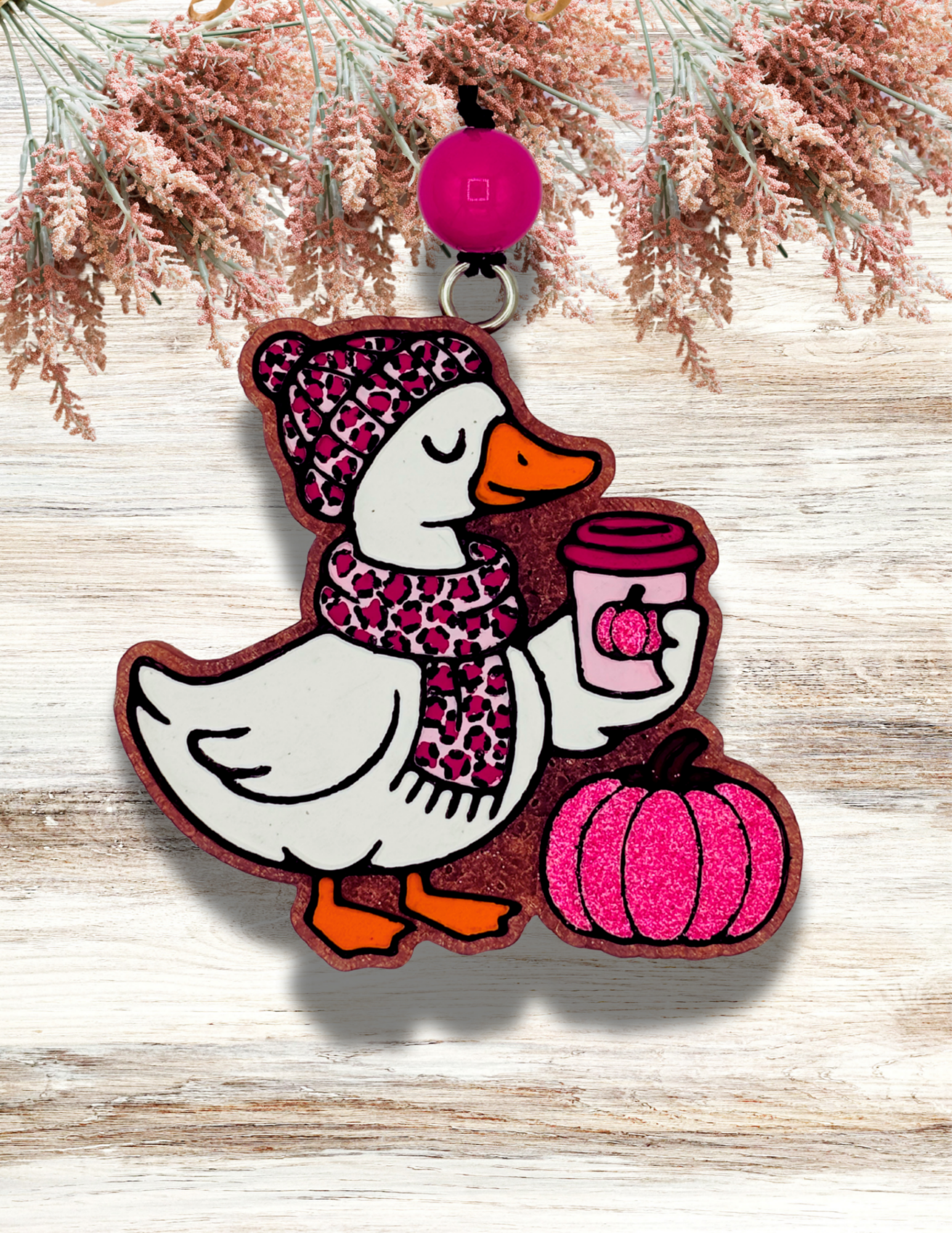 Adorable Goose with Latte and Pumpkin design in Pink Leopard. The fragrance is Blueberry Pumpkin Patch. Awesome for car, or any small space you want to smell amazing!
