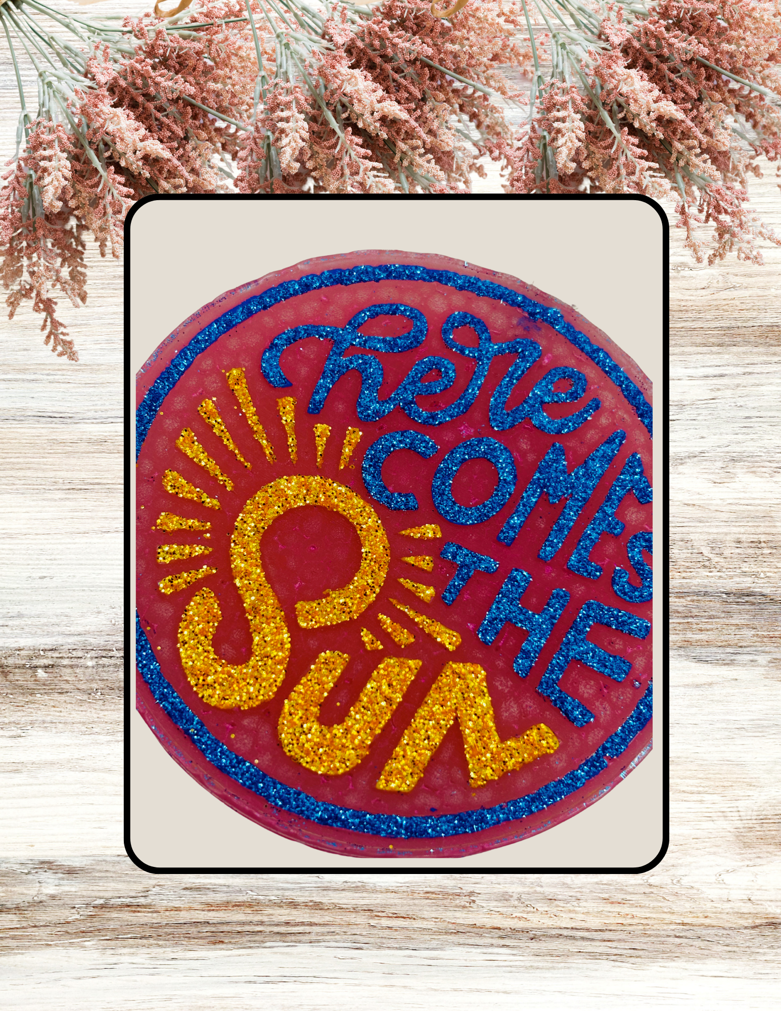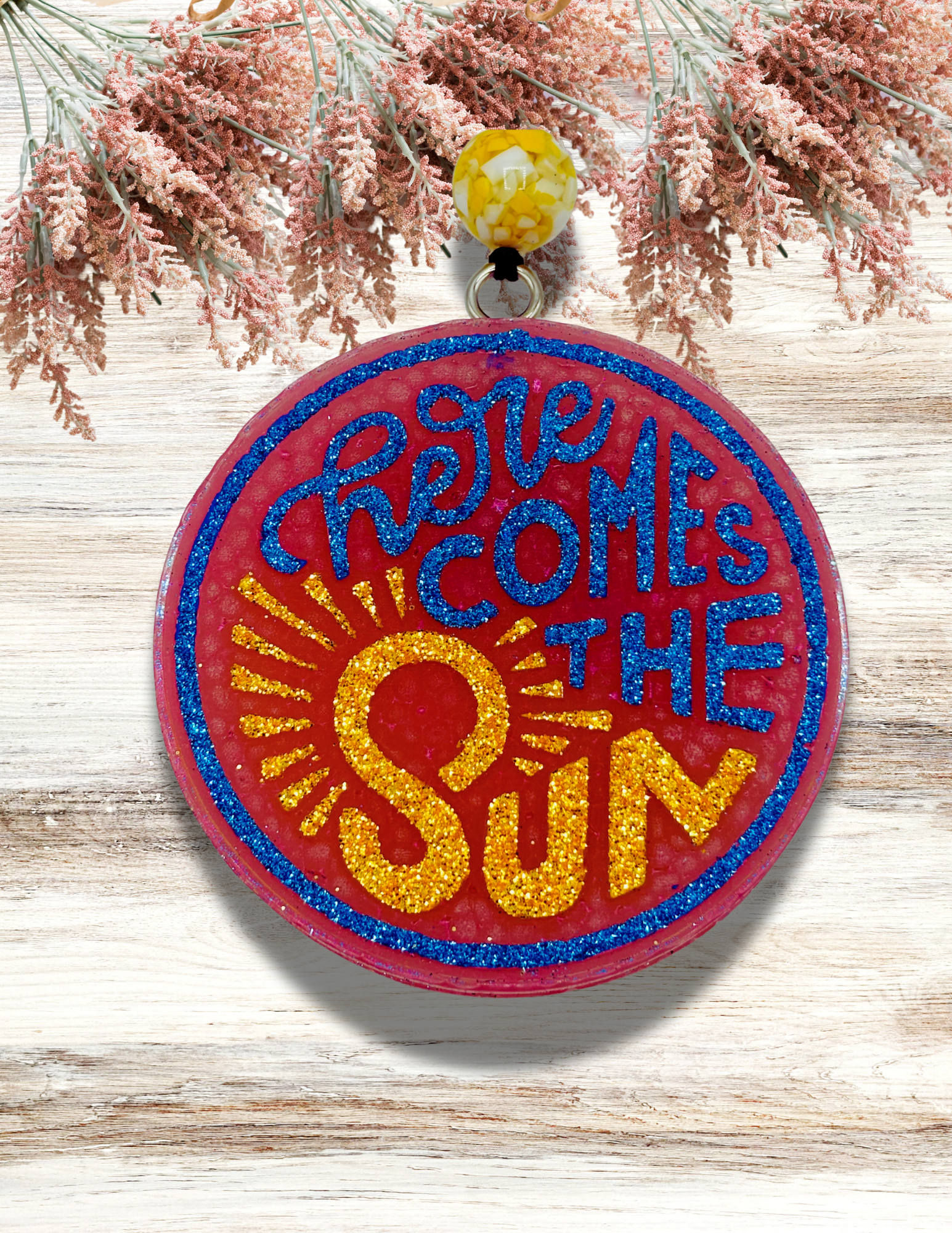 Adorable Here Comes The Sun Freshie design in Pink, Blue & Gold. The fragrance is Watermelon Lemonade Twist. Awesome for car, or any small space you want to smell amazing!