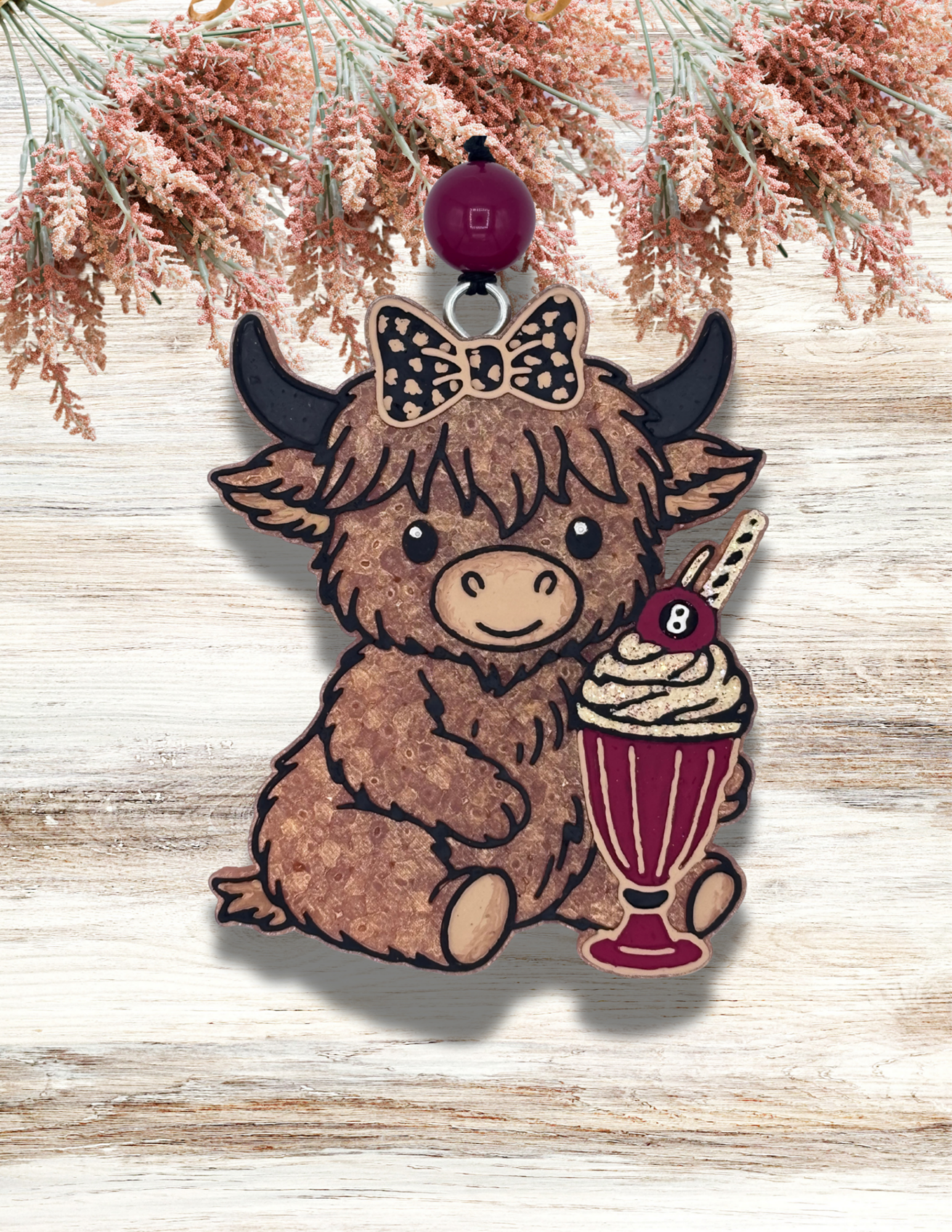 Adorable Highland cow with a black polka dot bow design and a 8 ball milkshake in red. The fragrance is Cotton Candy. Awesome for car, or any small space you want to smell amazing!