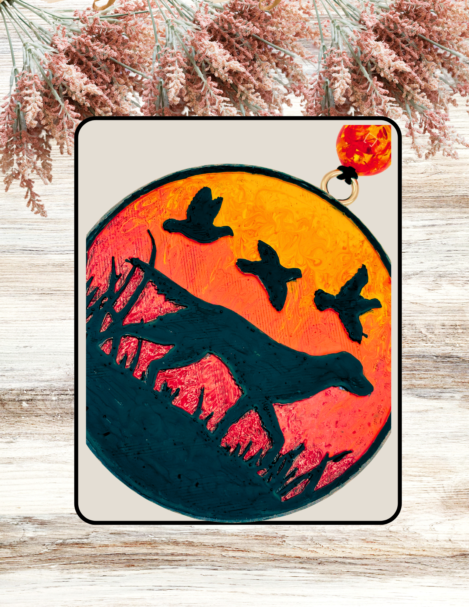 Adorable Hunting Dog with Sunset design in Red & Orange. The fragrance is Black Orchard by Tom Ford. Awesome for car, or any small space you want to smell amazing!