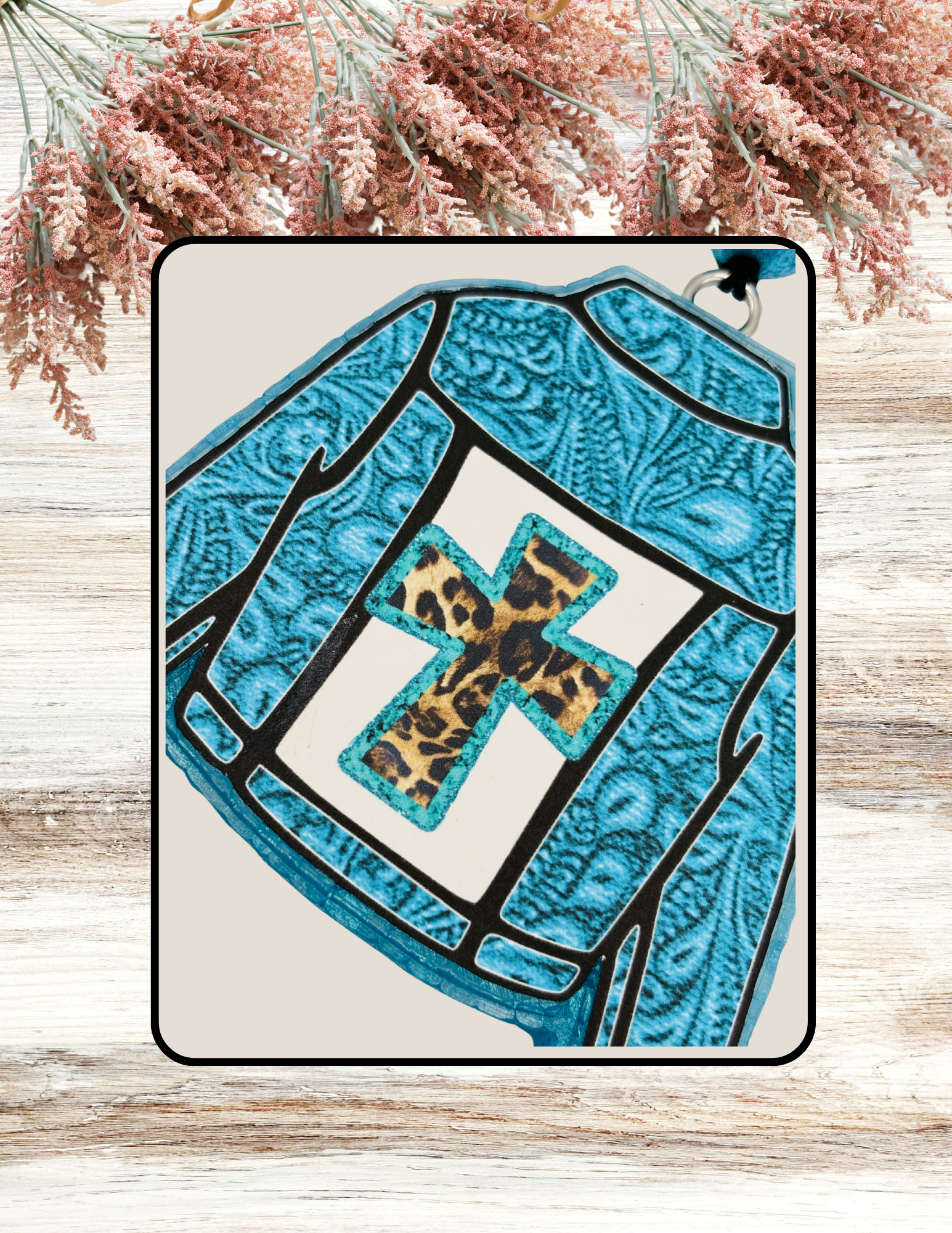 Adorable Teal Paisley Jacket Freshie with a cross design. The fragrance is Watermelon Lemonade Twist. Awesome for car, or any small space you want to smell amazing!