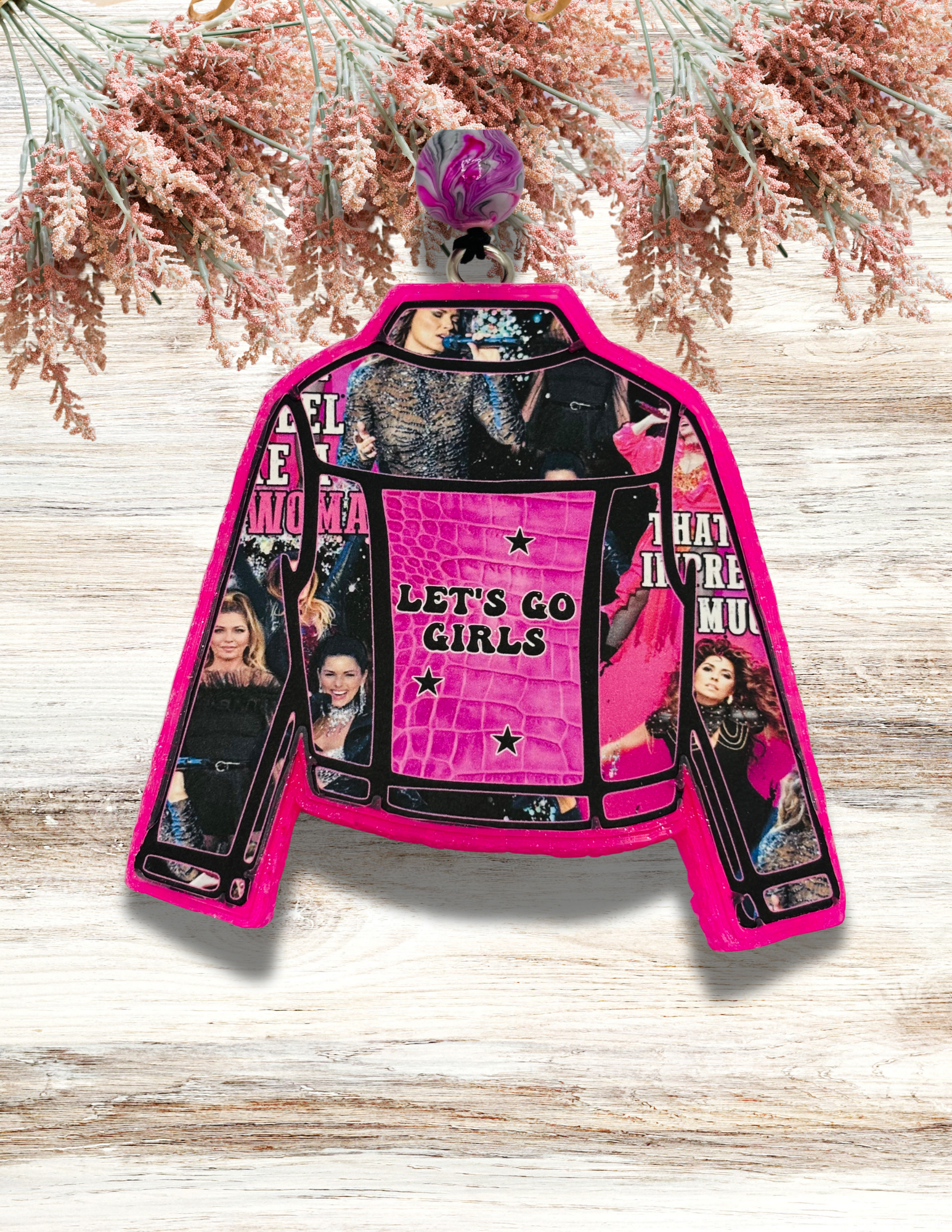 Adorable Hot Pink Print Jacket Freshie with a Let's Go Girls design. The fragrance is Sugar Plum Dream. Awesome for car, or any small space you want to smell amazing!