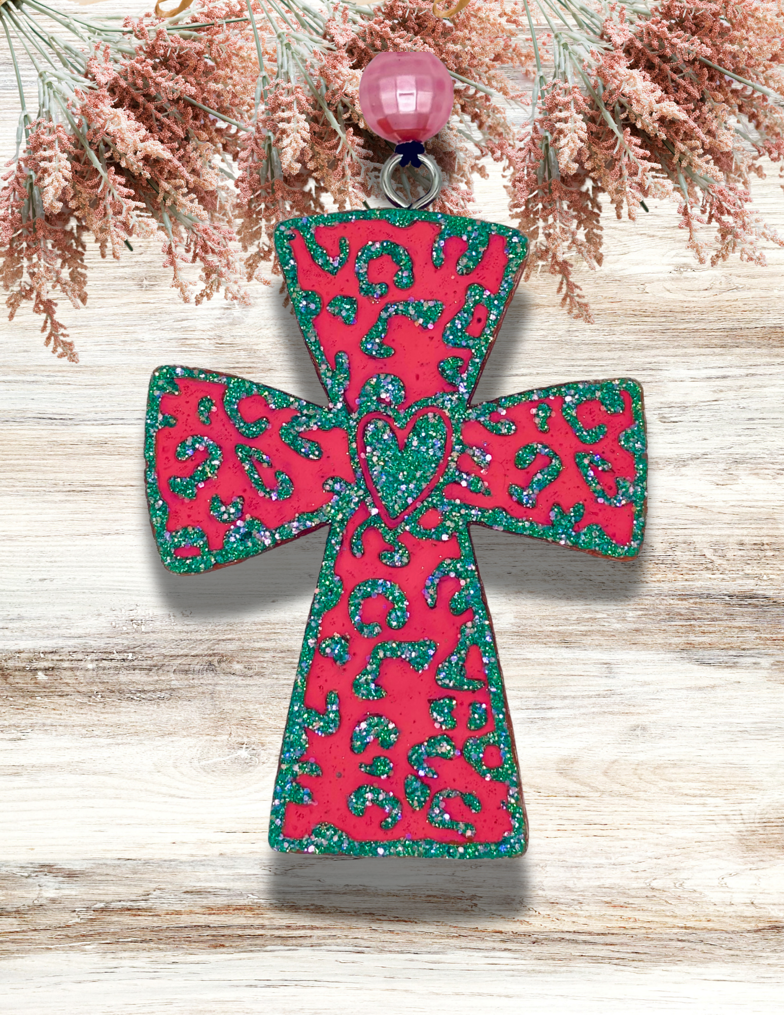 Adorable Coral & Mint Leopard Cross with a Glitter Mint Heart design. The fragrance is Peppermint Mocha. Awesome for car, or any small space you want to smell amazing!