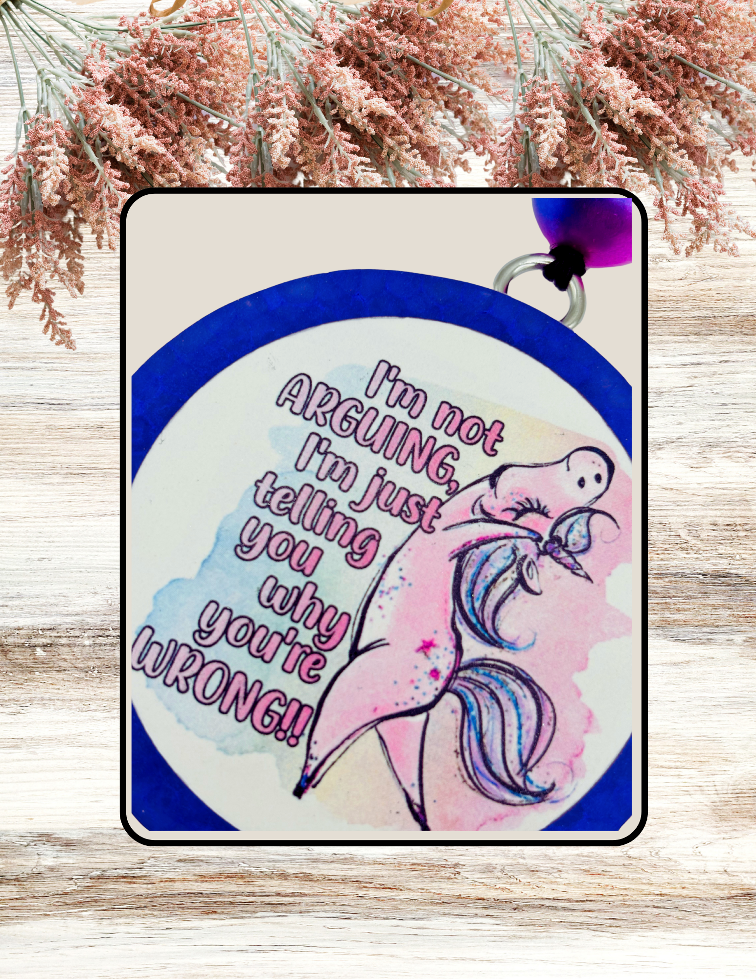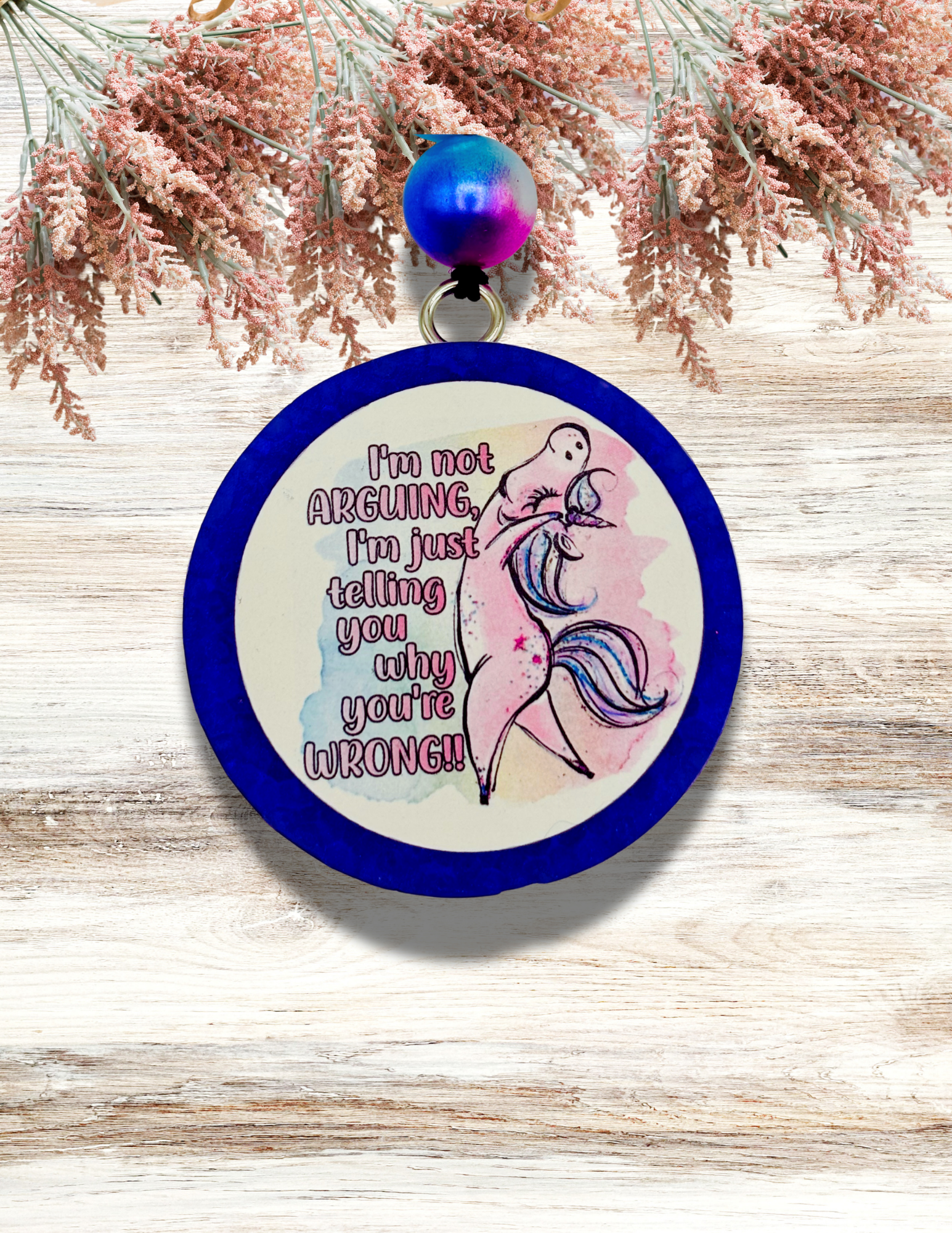 Adorable Freshie Round I'm Not Arguing I'm Just Telling You Why You're Wrong Print in Purple. The fragrance is Venice Peach Bellini. Awesome for car, or any small space you want to smell amazing!