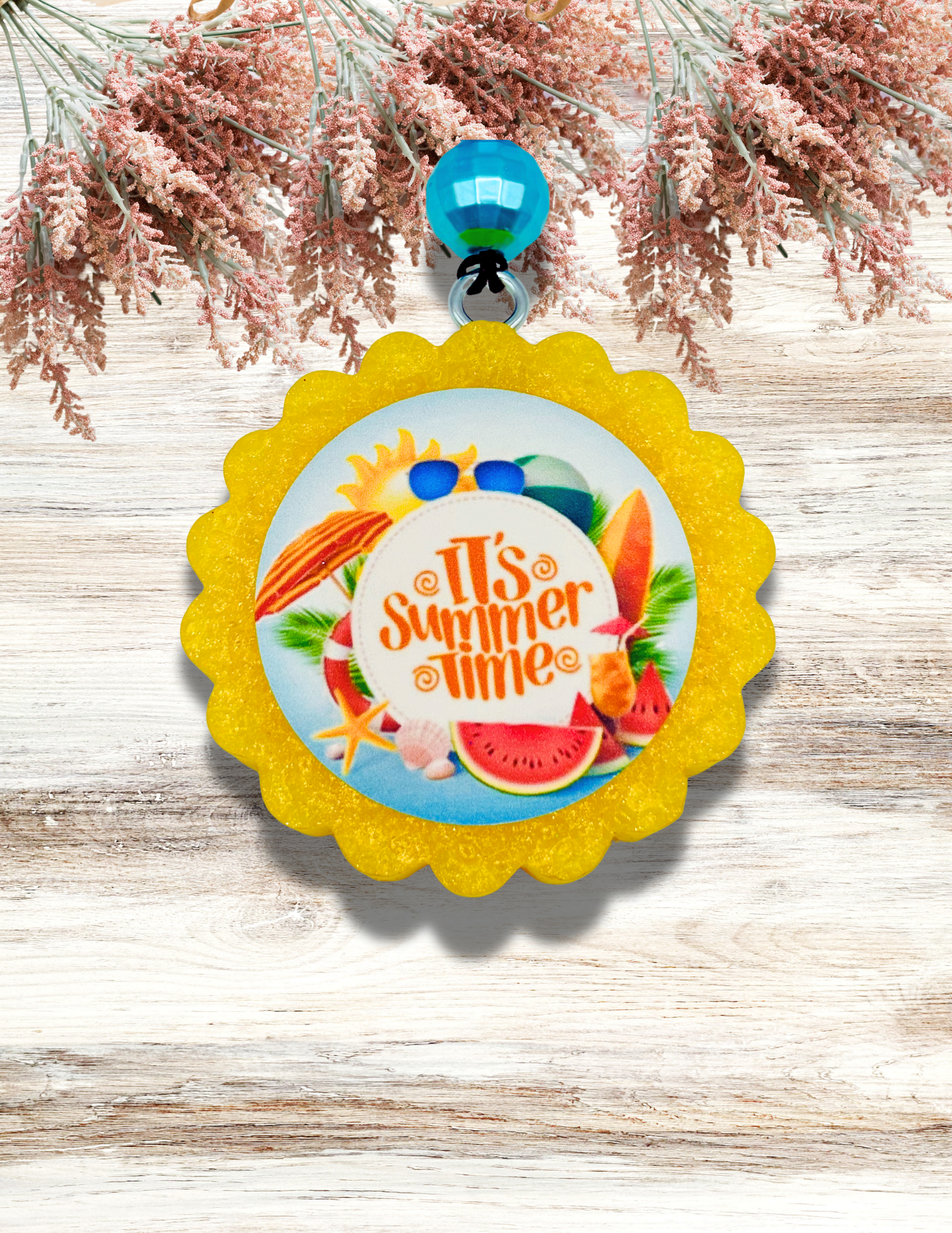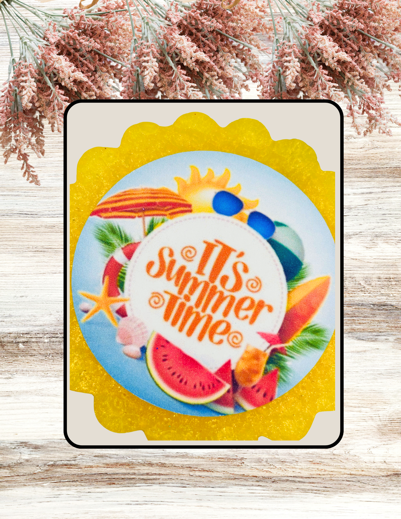 Adorable Freshie Round It's Summer Time Print in Yellow. The fragrance is Waikiki Beach Coconut. Awesome for car, or any small space you want to smell amazing!