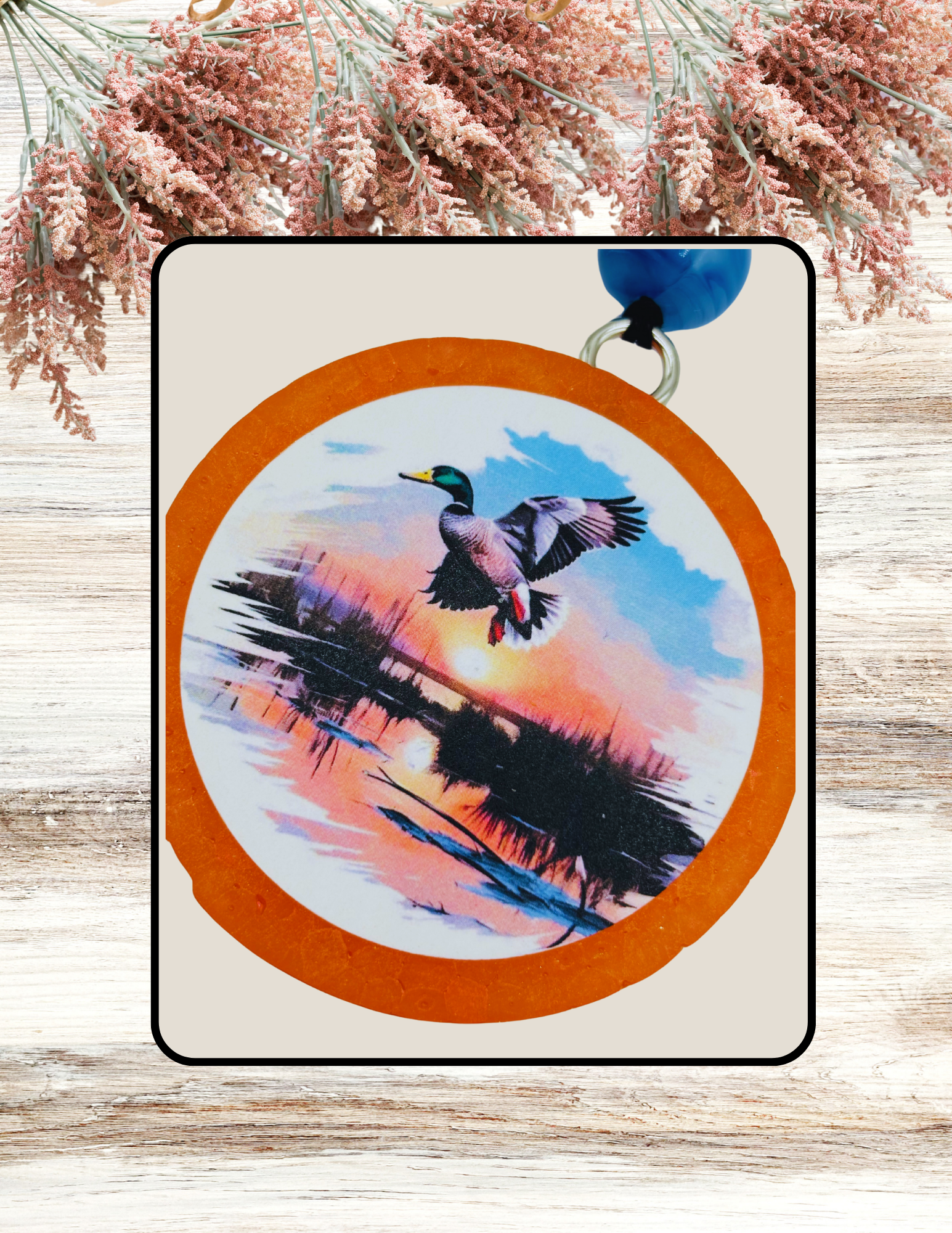 Adorable Freshie Round Mallard Lake Sunset Print in Orange. The fragrance is Black Ice. Awesome for car, or any small space you want to smell amazing!