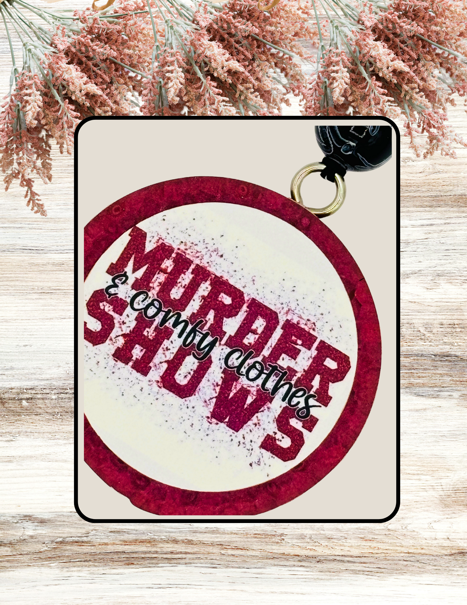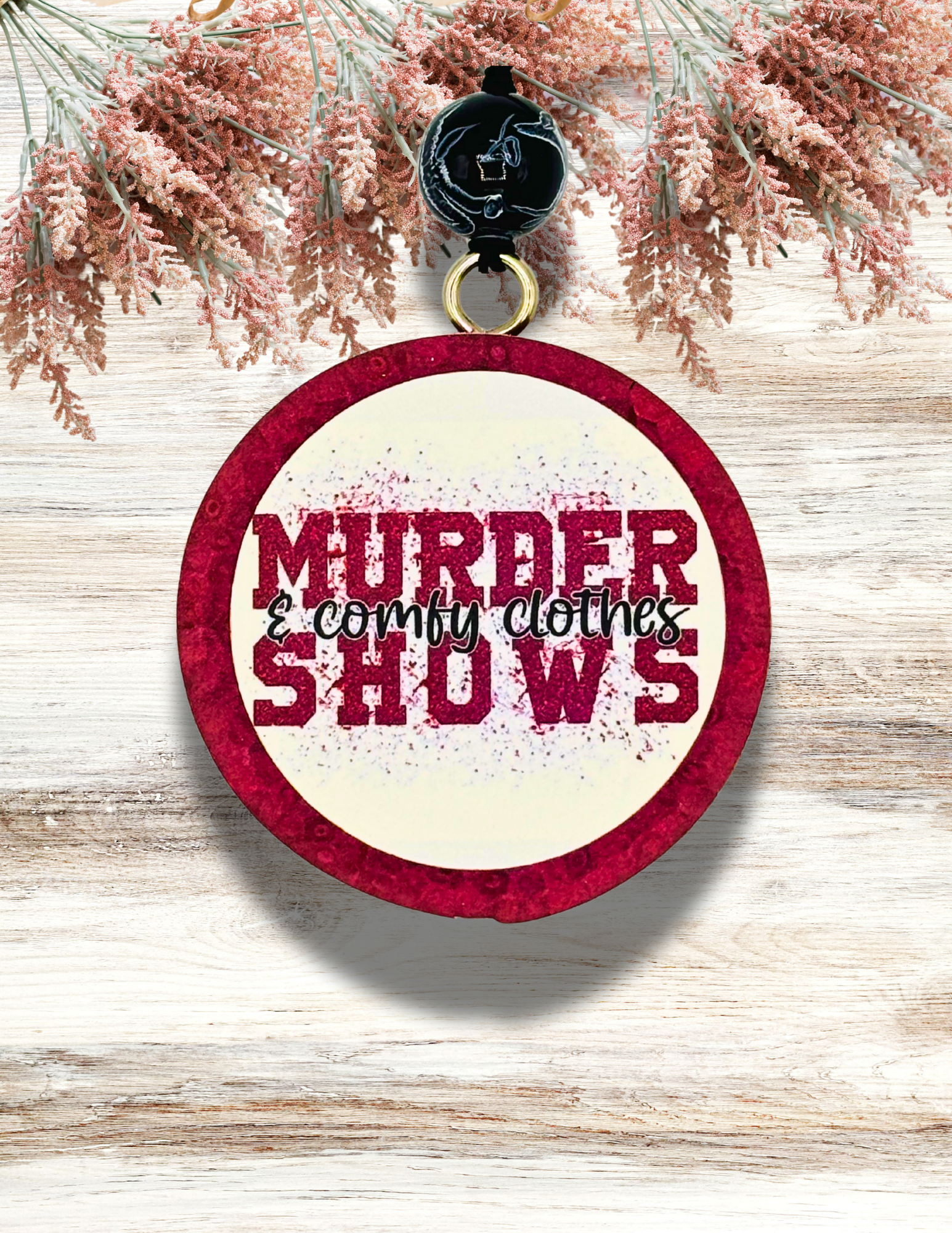Adorable Freshie Round Murder Shows & Comfy Clothes Print in Red. The fragrance is Brazilian Coffee. Awesome for car, or any small space you want to smell amazing!