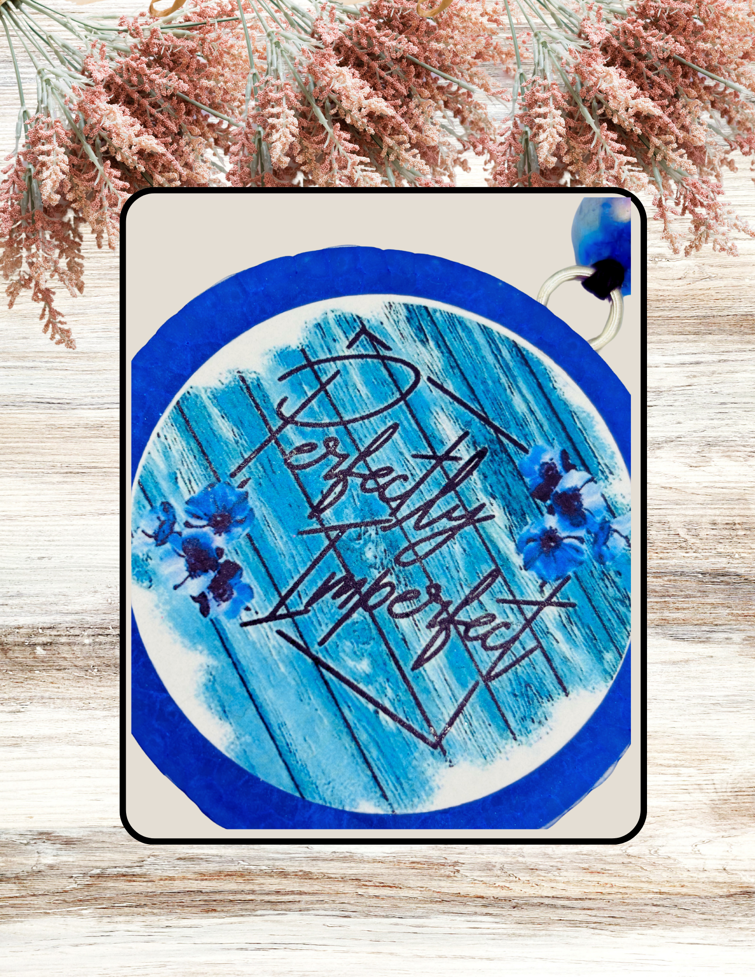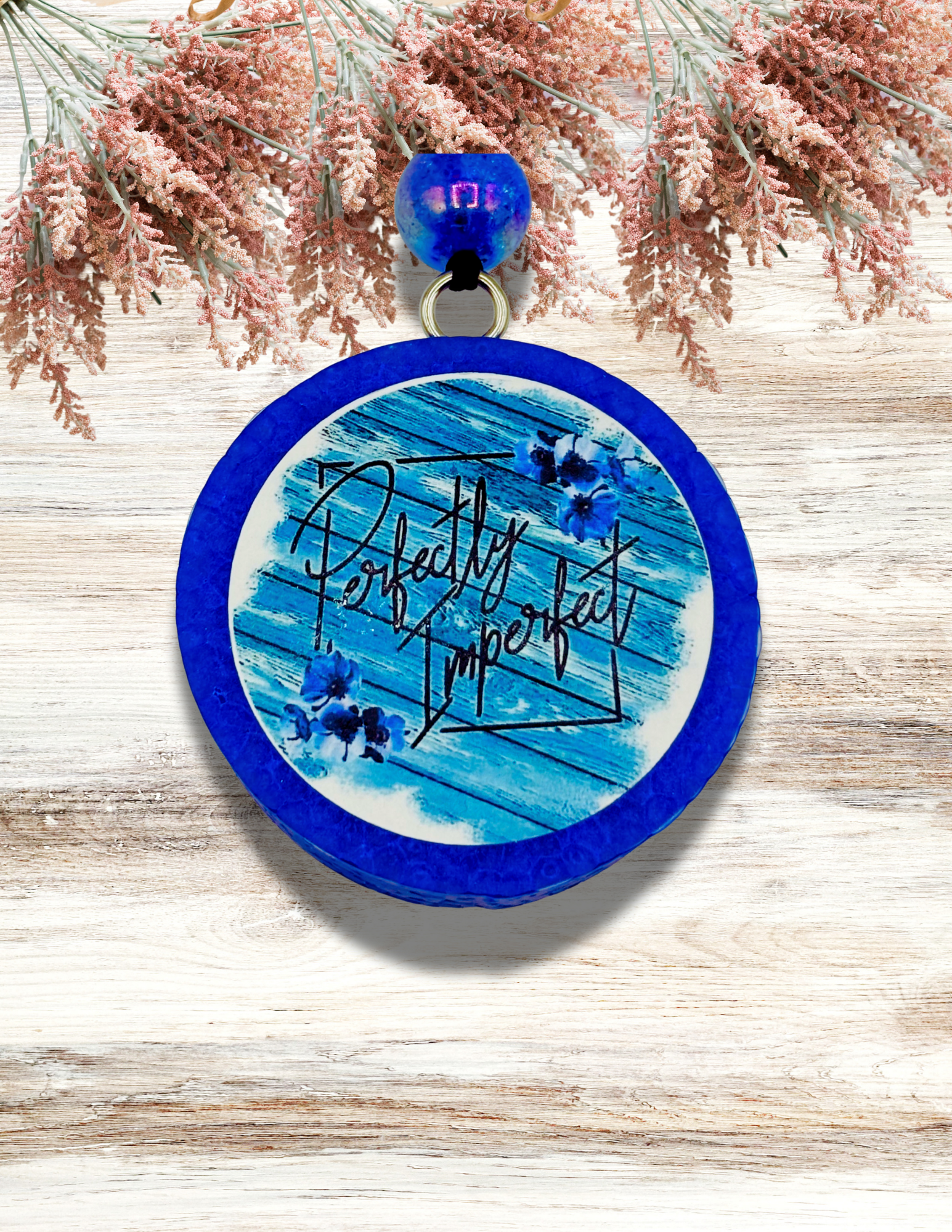Adorable Freshie Round Perfectly Imperfect in Blue. The fragrance is Sea Island Cotton. Awesome for car, or any small space you want to smell amazing!