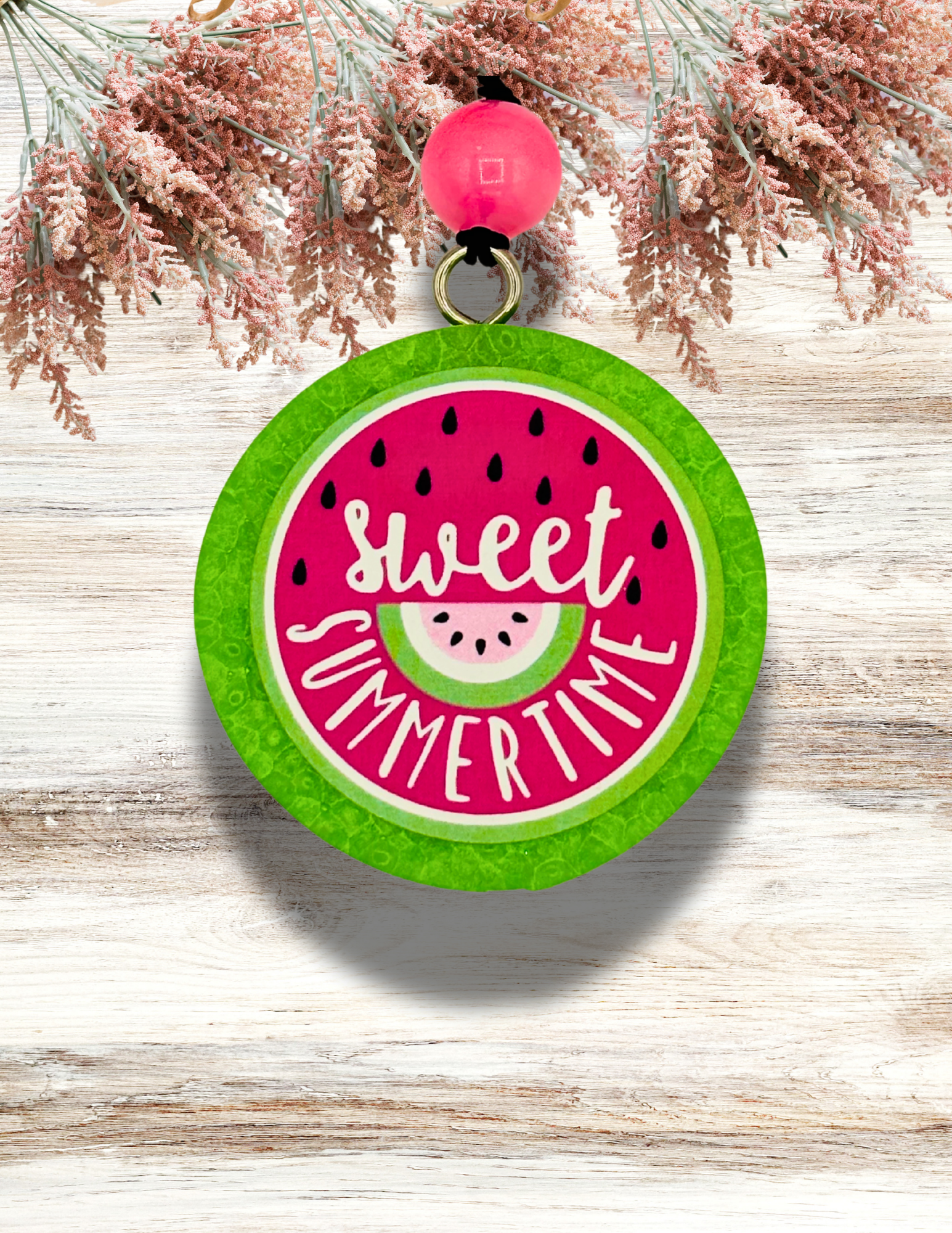 Adorable Freshie Round Sweet Summer Time Watermelon Print in Lime Green. The fragrance is Watermelon Lemonade Twist. Awesome for car, or any small space you want to smell amazing!