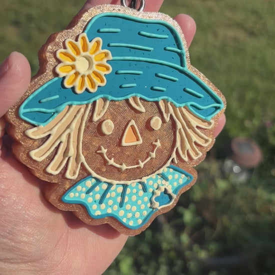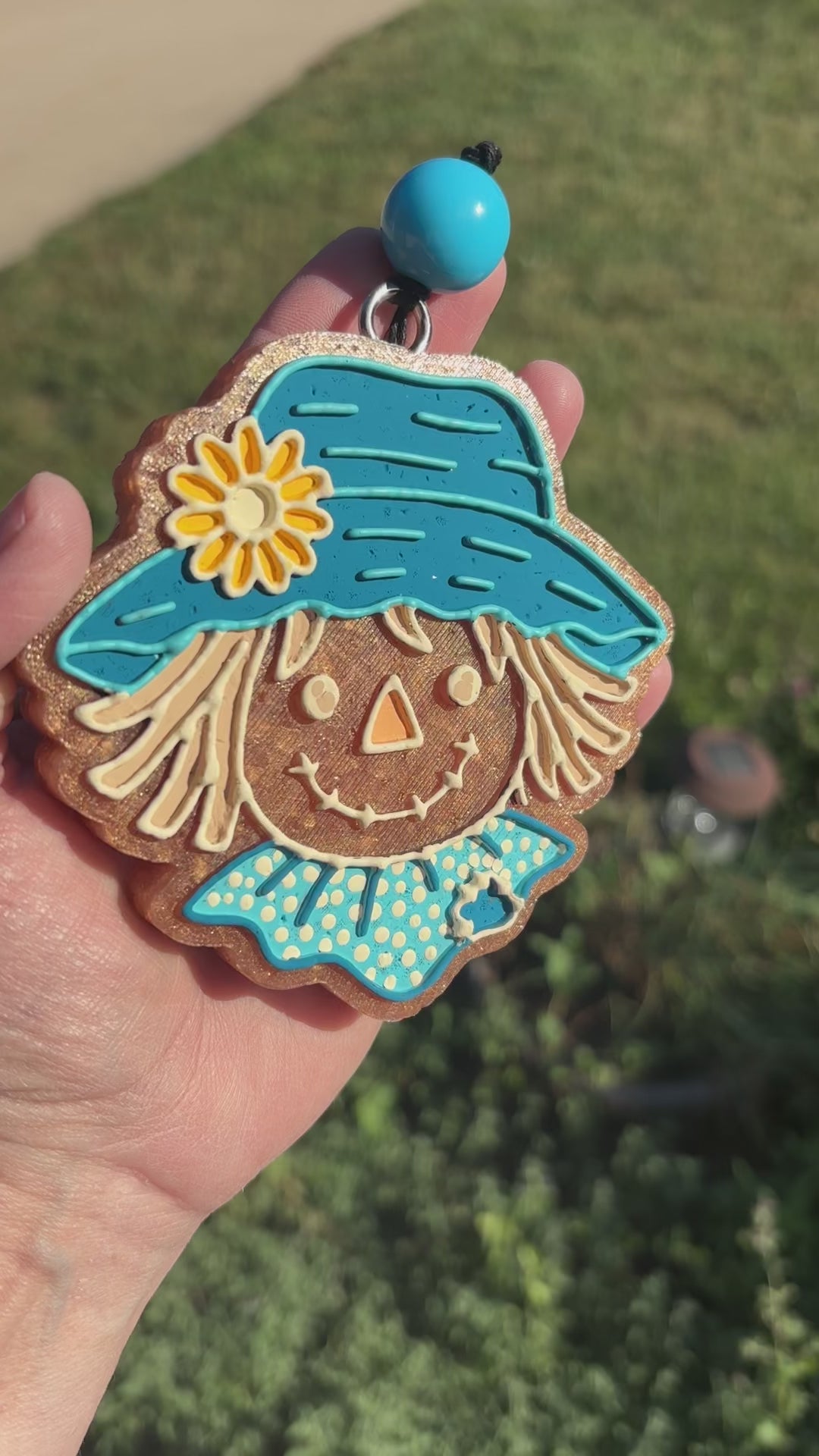 Adorable Scarecrow design in Teal. The fragrance is Marshmallow Fireside. Awesome for car, or any small space you want to smell amazing!