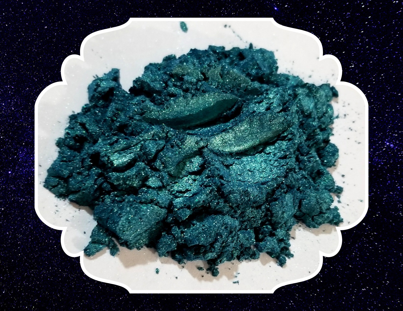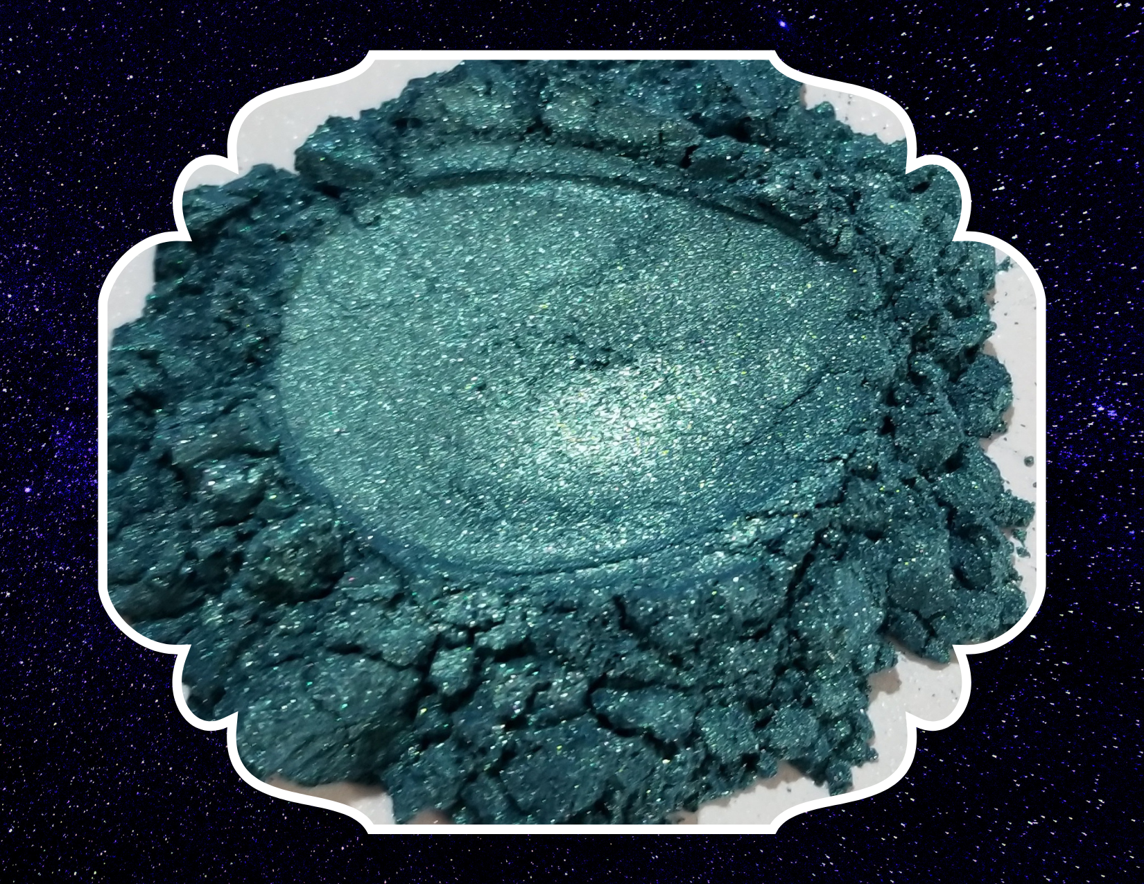 A duo chrome gorgeous turquoise blue to green chameleon powder. This chameleon brings you two shades of color in one. When looking at it straight on it appears one color and from an angle another color. Sold by volume in a 5 gram pot.